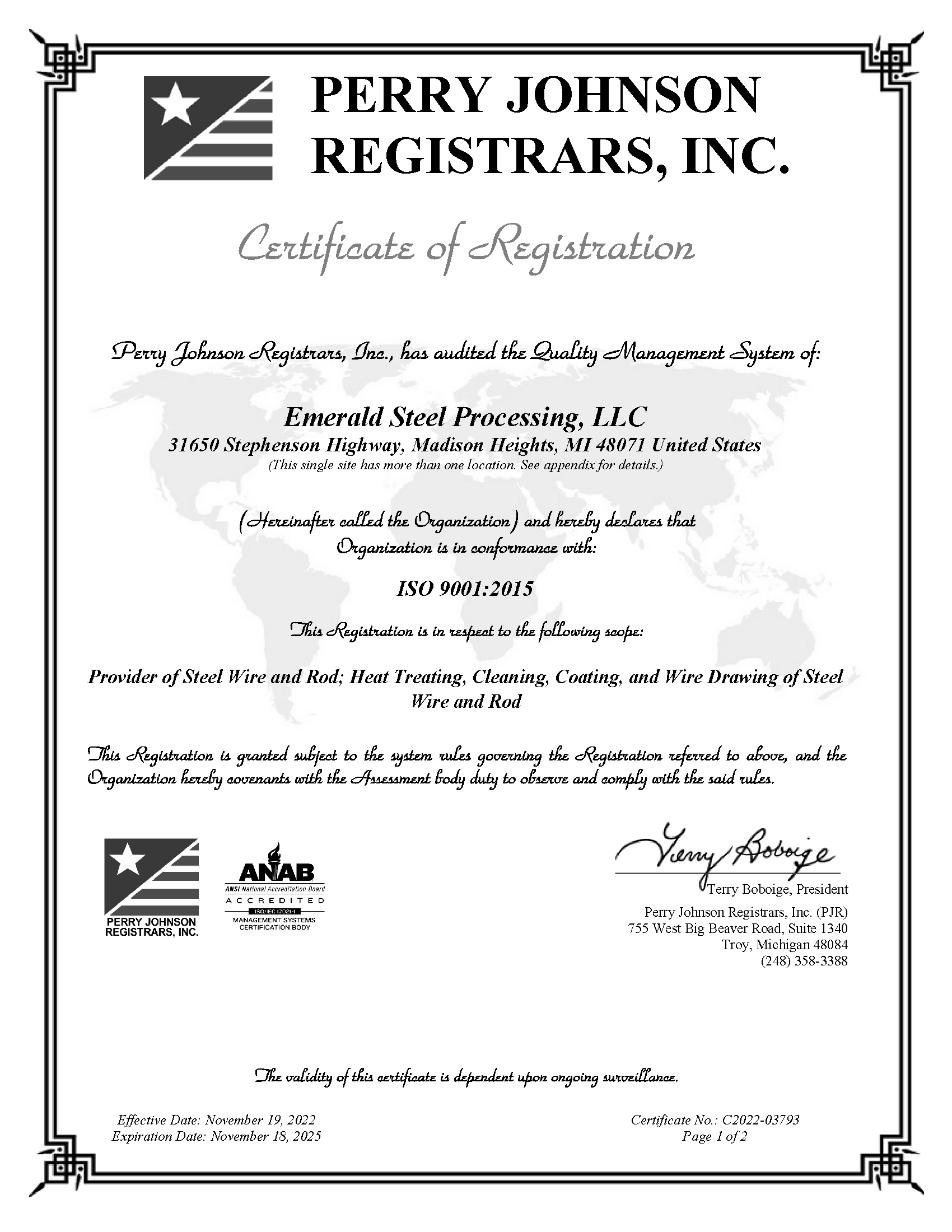Emerald Steel Processing was founded in 2001 by Chuck O’Brien to promote North American Leadership in Steel Processing for the cold heading industry. We strive for exceptional quality with a commitment to a defect free product, on time delivery and exceptional service. We are a service oriented steel processor specializing in Just in Time (JIT) programs designed to reduce inventory levels at the end user. This enables us to supply JIT raw material to our customers to meet their fast paced industry needs